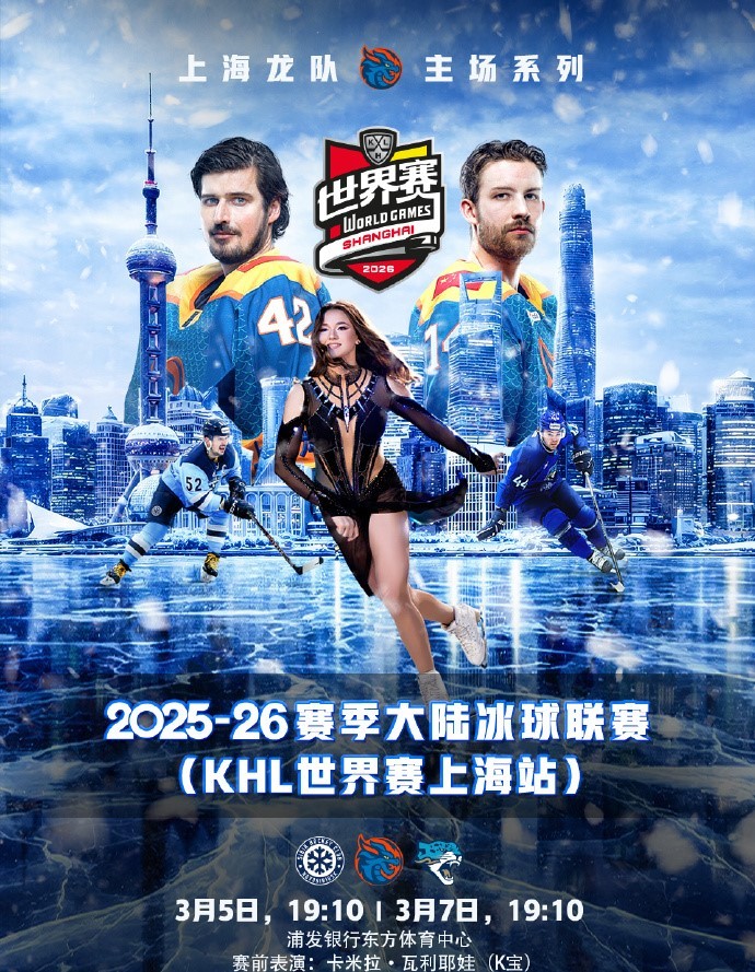 2025—2026赛季大陆冰球联赛(KHL世界赛上海站)将在东方体育中心拉开序幕。上海龙队回归中国主场,于3月5日和3月7日,先后迎战来自俄罗斯的新西伯利亚西伯尔队和来自哈萨克斯坦的阿斯塔纳雪豹队。