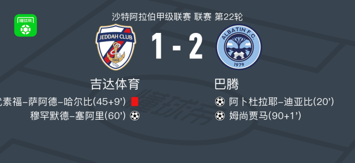 北京时间2月15日沙特阿拉伯甲级联赛 联赛 第22轮,吉达体育主场对阵巴腾。吉达体育穆罕默德-塞阿里破门。巴腾阿卜杜拉耶-迪亚比破门,姆尚贾马破门。最终比分吉达体育 1-2 巴坦。