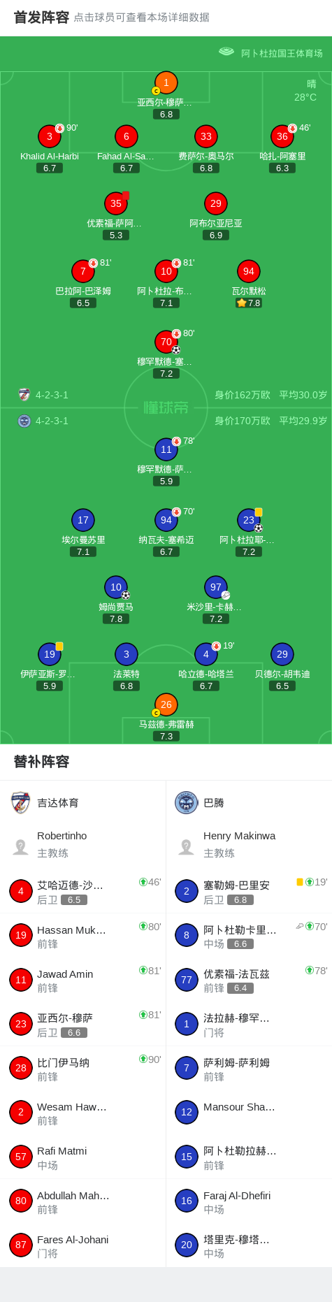巴坦2-1吉达体育,姆尚贾马、阿卜杜拉耶-迪亚比破门
