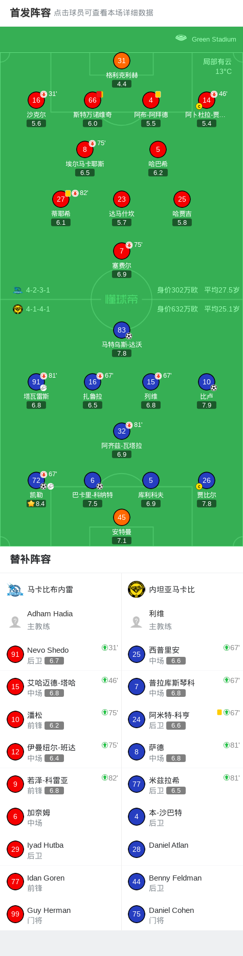 内坦亚马卡比4-0大胜马卡比布内雷,巴卡里-科纳特破门,马特乌斯-达沃建功