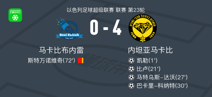 北京时间2月15日以色列足球超级联赛 联赛 第23轮,马卡比布内雷主场对阵内坦亚马卡比。内坦亚马卡比凯勒破门,比卢破门,马特乌斯-达沃破门,巴卡里-科纳特破门。最终比分马卡比布内雷 0-4 内坦亚马卡比。