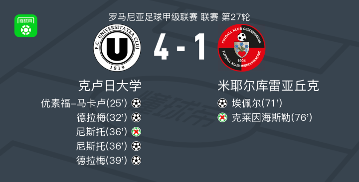 克卢日大学4-1大胜米耶尔库雷亚丘克,德拉梅梅开二度,尼斯托建功