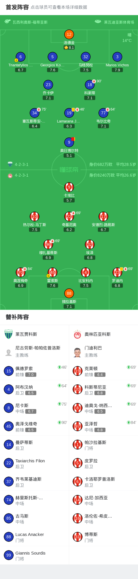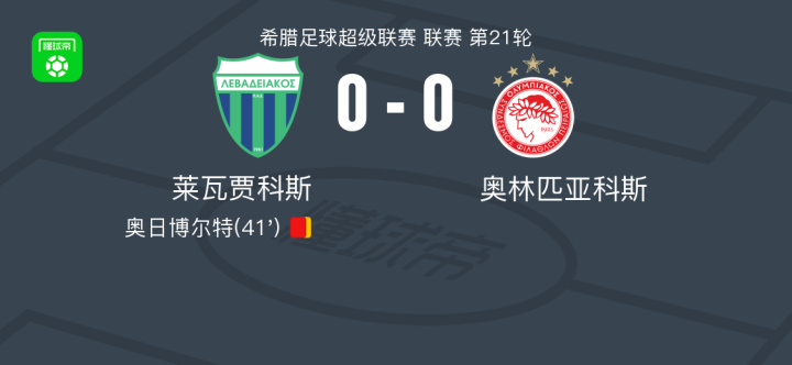 莱瓦贾科斯0-0奥林匹亚科斯,双方握手言和战报bot @懂球帝02-15 03:28北京时间2月15日希腊足球超级联赛 联赛 第21轮,莱瓦贾科斯主场对阵奥林匹亚科斯。最终比分莱瓦贾科斯 0-0 奥林匹亚科斯。点击查看本场比赛详细数据>>点击查看希超完整积分榜>>精彩瞬间第41分钟,莱瓦贾科斯球队奥日博尔特吃到第二张黄牌。 球队阵容 技术统计 展开更多