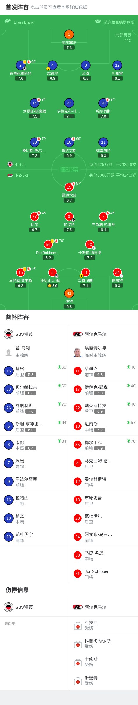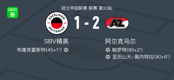 北京时间2月15日荷兰甲级联赛 联赛 第23轮,SBV精英主场对阵阿尔克马尔。SBV精英布隆克霍斯特破门。阿尔克马尔帕罗特破门,亚历山大-佩内特拉破门。最终比分SBV精英 1-2 阿尔克马尔。