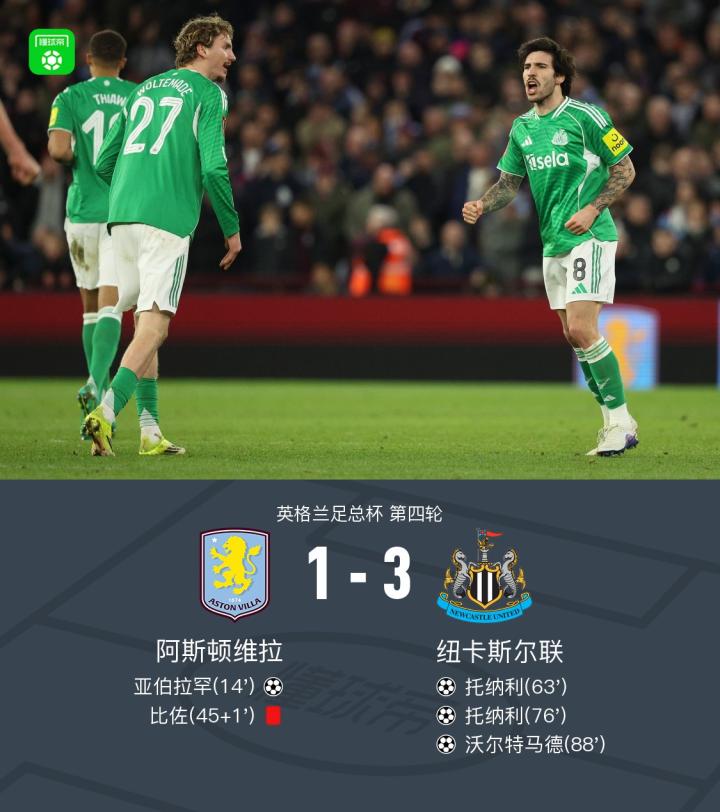 北京时间2月15日英格兰足总杯 第四轮,阿斯顿维拉对阵纽卡斯尔联。上半场亚伯拉罕争议球破门,比佐出击犯规被直红罚下。下半场托纳利连进两球反超比分,沃尔特马德破门扩大比分。最终比分阿斯顿维拉 1-3 纽卡斯尔联。