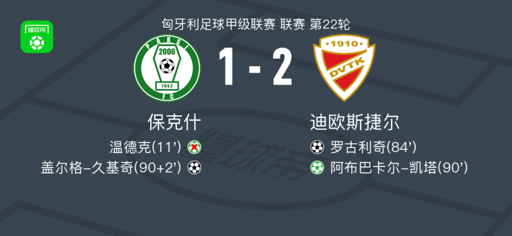 北京时间2月15日匈牙利足球甲级联赛 联赛 第22轮,保克什主场对阵迪欧斯捷尔。保克什盖尔格-久基奇破门。迪欧斯捷尔罗古利奇破门,阿布巴卡尔-凯塔破门。最终比分保克什 1-2 迪欧斯捷尔。