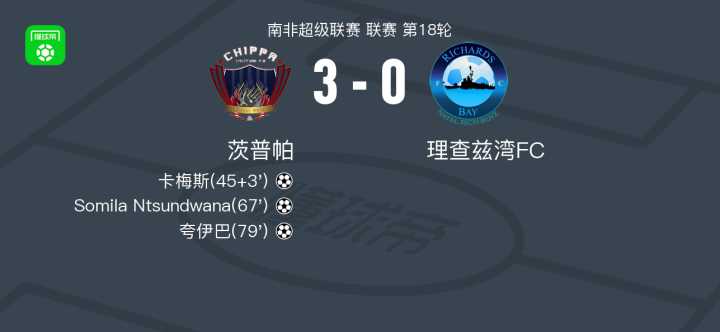 北京时间2月15日南非超级联赛 联赛 第18轮,茨普帕主场对阵理查兹湾FC。茨普帕卡梅斯破门,Somila Ntsundwana破门,夸伊巴破门。最终比分茨普帕 3-0 理查兹湾FC。