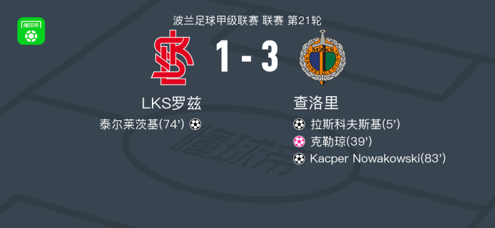 北京时间2月15日波兰足球甲级联赛 联赛 第21轮,LKS罗兹主场对阵查洛里。LKS罗兹泰尔莱茨基破门,克勒琼自摆乌龙。查洛里拉斯科夫斯基破门,Kacper Nowakowski破门。最终比分罗德茨 1-3 查洛里。
