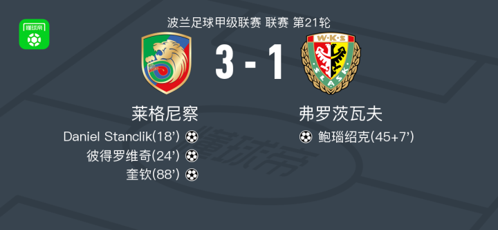 北京时间2月15日波兰足球甲级联赛 联赛 第21轮,莱格尼察主场对阵弗罗茨瓦夫。莱格尼察Daniel Stanclik破门,彼得罗维奇破门,奎钦破门。弗罗茨瓦夫鲍瑙绍克破门。最终比分马特斯 3-1 弗罗茨瓦夫。