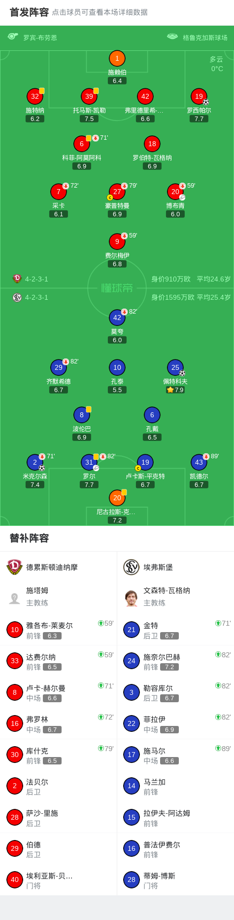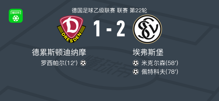 北京时间2月15日德国足球乙级联赛 联赛 第22轮,德累斯顿迪纳摩主场对阵埃弗斯堡。德累斯顿迪纳摩罗西帕尔破门。埃弗斯堡米克尔森破门,佩特科夫破门。最终比分德累斯顿迪纳摩 1-2 埃弗斯堡。