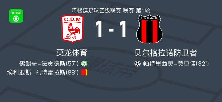 北京时间2月15日阿根廷足球乙级联赛 联赛 第1轮,莫龙体育主场对阵贝尔格拉诺防卫者。莫龙体育佛朗哥-法贡德斯破门。贝尔格拉诺防卫者帕特里西奥-莫亚诺破门。最终比分莫龙体育 1-1 贝尔格拉诺防卫者。