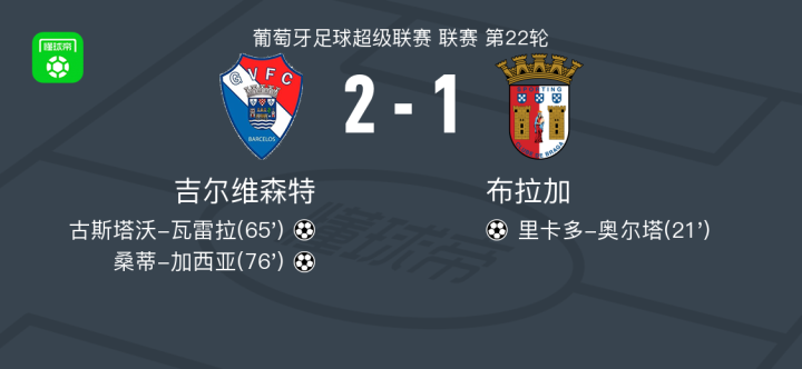 北京时间2月15日葡萄牙足球超级联赛 联赛 第22轮,吉尔维森特主场对阵布拉加。吉尔维森特古斯塔沃-瓦雷拉破门,桑蒂-加西亚破门。布拉加里卡多-奥尔塔破门。最终比分吉尔维森特 2-1 布拉加。