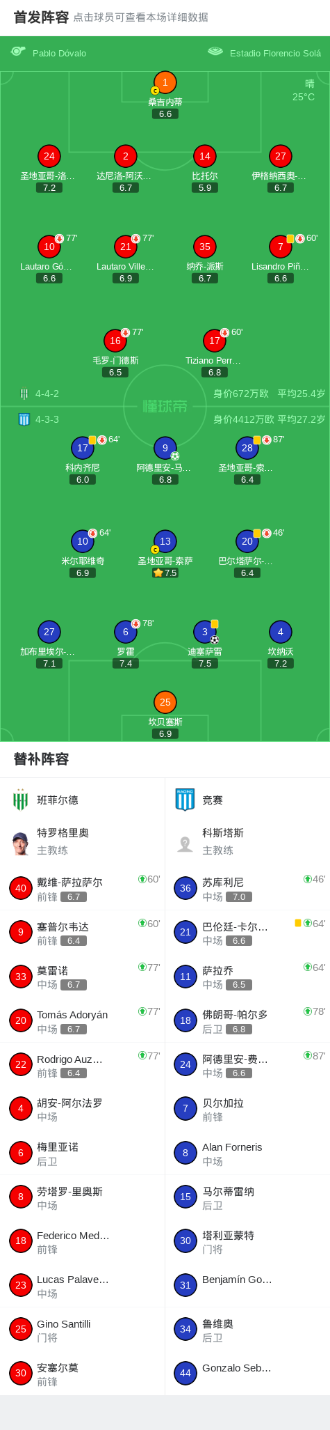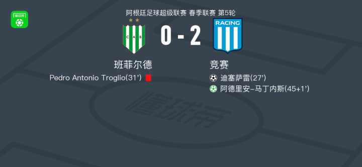 北京时间2月15日阿根廷足球超级联赛 春季联赛 第5轮,班菲尔德主场对阵竞赛。竞赛迪塞萨雷破门,阿德里安-马丁内斯破门。最终比分班菲尔德 0-2 竞赛。