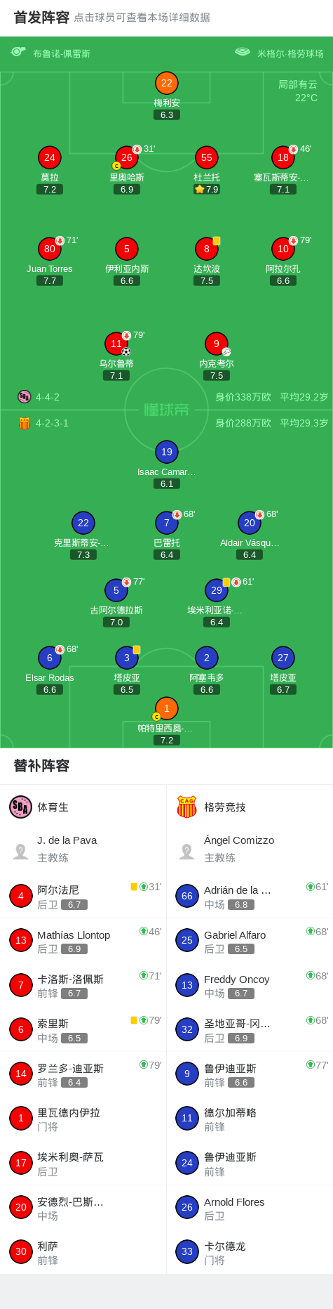 体育生1-0格劳竞技,乌尔鲁蒂打进全场唯一进球战报bot @懂球帝02-15 08:30北京时间2月15日秘鲁足球甲级联赛 春季联赛 第3轮,体育生主场对阵格劳竞技。体育生乌尔鲁蒂破门。最终比分体育生 1-0 格劳竞技。点击查看本场比赛详细数据>>点击查看秘鲁甲完整积分榜>>精彩瞬间第59分钟,体育生球员内克考尔助攻乌尔鲁蒂打入一球。 球队阵容 技术统计 展开更多