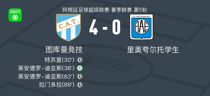 北京时间2月15日阿根廷足球超级联赛 春季联赛 第5轮,图库曼竞技主场对阵里奥夸尔托学生。图库曼竞技特苏里破门,莱安德罗-迪亚斯梅开二度,拉门多拉破门。最终比分图库曼竞技 4-0 里奥夸尔托学生。