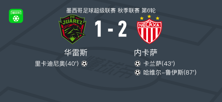 北京时间2月15日墨西哥足球超级联赛 秋季联赛 第6轮,华雷斯主场对阵内卡萨。华雷斯里卡迪尼奥破门。内卡萨卡兰萨破门,哈维尔-鲁伊斯破门。最终比分华雷斯 1-2 内卡萨。