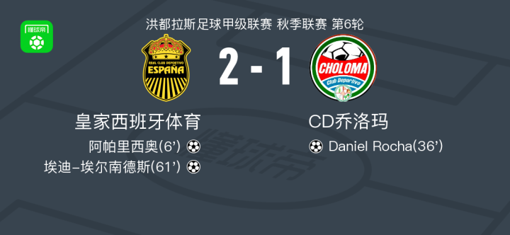 北京时间2月15日洪都拉斯足球甲级联赛 秋季联赛 第6轮,皇家西班牙体育主场对阵CD乔洛玛。皇家西班牙体育阿帕里西奥破门,埃迪-埃尔南德斯破门。CD乔洛玛Daniel Rocha破门。最终比分皇家西班牙体育 2-1 CD乔洛玛。