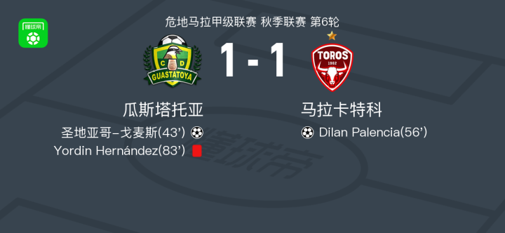 北京时间2月15日危地马拉甲级联赛 秋季联赛 第6轮,瓜斯塔托亚主场对阵马拉卡特科。瓜斯塔托亚圣地亚哥-戈麦斯破门。马拉卡特科Dilan Palencia破门。最终比分瓜斯塔托亚 1-1 马拉卡特科。