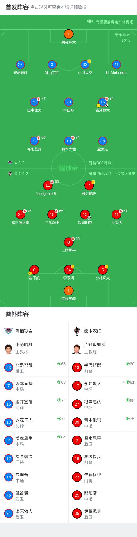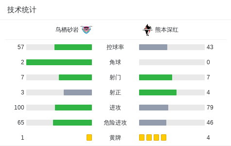 北京时间2月15日日本职业J2/J3百年构想联赛 西区B组 第2轮,鸟栖砂岩主场对阵熊本深红。鸟栖砂岩西泽健太破门。熊本深红饭星明良破门。最终比分鸟栖砂岩 5-4 熊本深红。