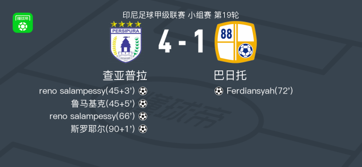 查亚普拉4-1大胜巴日托,reno salampessy两球,斯罗耶尔破门