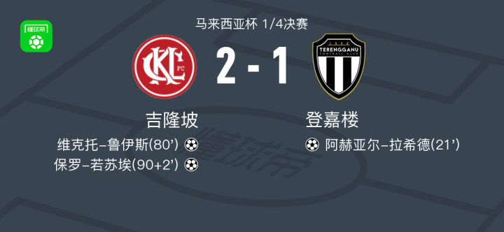 北京时间2月15日马来西亚杯 1/4决赛,吉隆坡对阵登嘉楼。吉隆坡维克托-鲁伊斯破门,保罗-若苏埃破门。登嘉楼阿赫亚尔-拉希德破门。最终比分吉隆坡 2-1 登嘉楼。