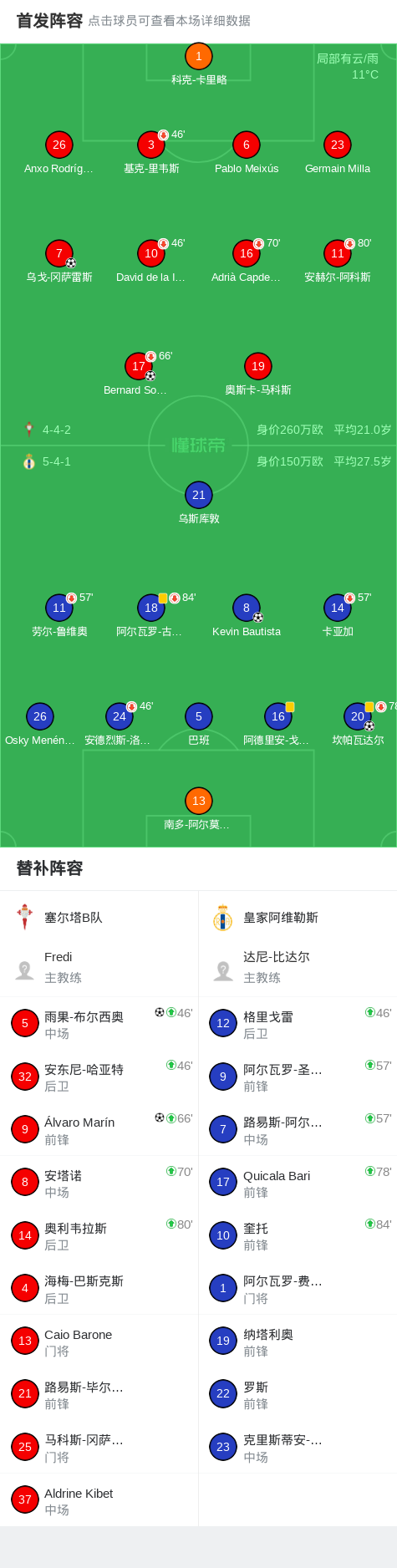 第73分钟,塞尔塔B队球员Álvaro Marín打入一球。
