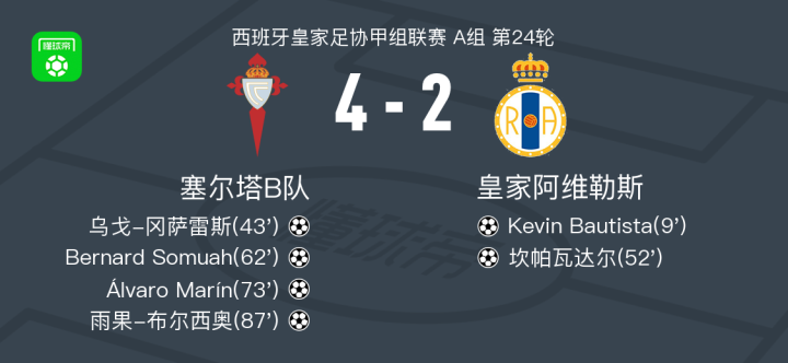 北京时间2月15日西班牙皇家足协甲组联赛 A组 第24轮,塞尔塔B队主场对阵皇家阿维勒斯。塞尔塔B队乌戈-冈萨雷斯破门,Bernard Somuah破门,Álvaro Marín破门,雨果-布尔西奥破门。皇家阿维勒斯Kevin Bautista破门,坎帕瓦达尔破门。最终比分塞尔塔B队 4-2 皇家阿维勒斯。