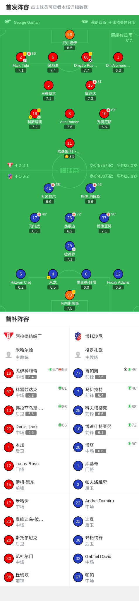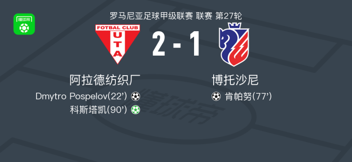 北京时间2月15日罗马尼亚足球甲级联赛 联赛 第27轮,阿拉德纺织厂主场对阵博托沙尼。阿拉德纺织厂Dmytro Pospelov破门,科斯塔凯破门。博托沙尼肯帕努破门。最终比分阿拉德纺织厂 2-1 博托沙尼。