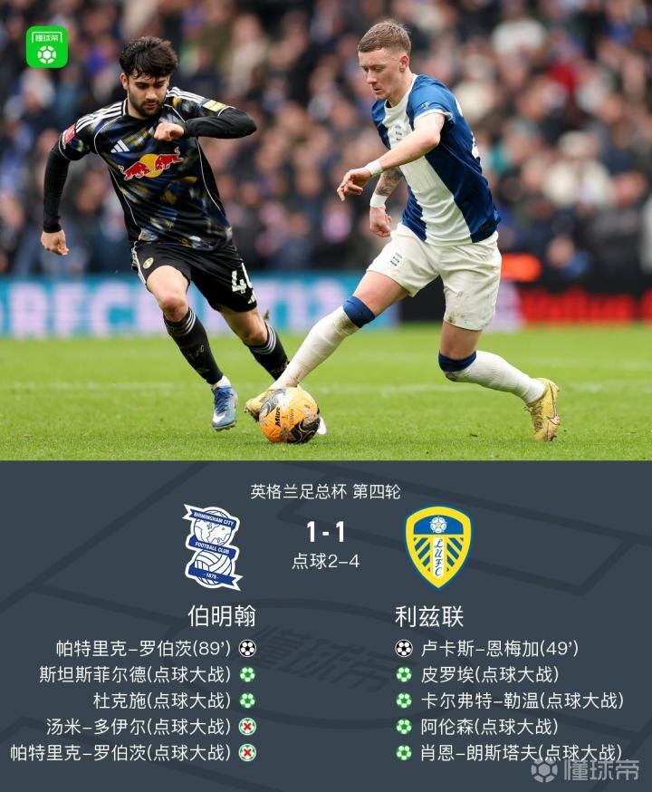 足总杯:利兹联历经点球总分5-3伯明翰晋级,罗伯茨绝平+失点