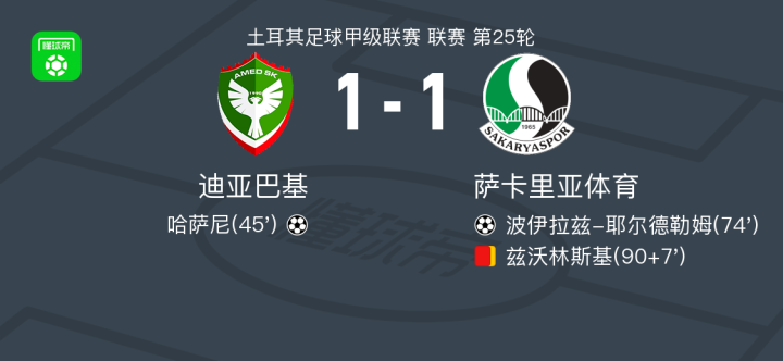 北京时间2月15日土耳其足球甲级联赛 联赛 第25轮,迪亚巴基主场对阵萨卡里亚体育。迪亚巴基哈萨尼破门。萨卡里亚体育波伊拉兹-耶尔德勒姆破门。最终比分迪亚巴基 1-1 萨卡里亚体育。