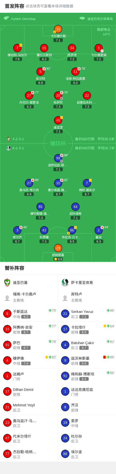 迪亚巴基1-1萨卡里亚体育,哈萨尼打破僵局,波伊拉兹-耶尔德勒姆扳平比分