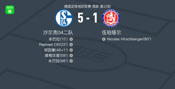 北京时间2月15日德国足球地区联赛 西部 第22轮,沙尔克04二队主场对阵伍珀塔尔。沙尔克04二队本巴拉梅开二度,Raphael Ott破门,郑因兼破门,维格坎普破门。伍珀塔尔Nicolas Hirschberger破门。最终比分沙尔克04二队 5-1 伍珀塔尔。