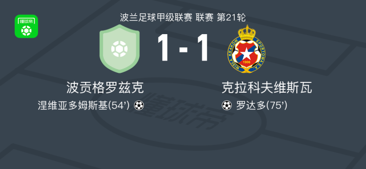 北京时间2月15日波兰足球甲级联赛 联赛 第21轮,波贡格罗兹克主场对阵克拉科夫维斯瓦。波贡格罗兹克涅维亚多姆斯基破门。克拉科夫维斯瓦罗达多破门。最终比分波贡格罗兹克 1-1 克拉科夫维斯瓦。