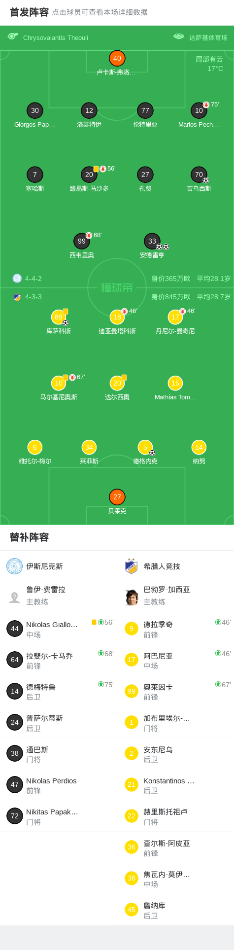 第75分钟,希腊人竞技球员库萨科斯打入一球。