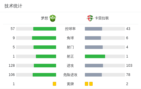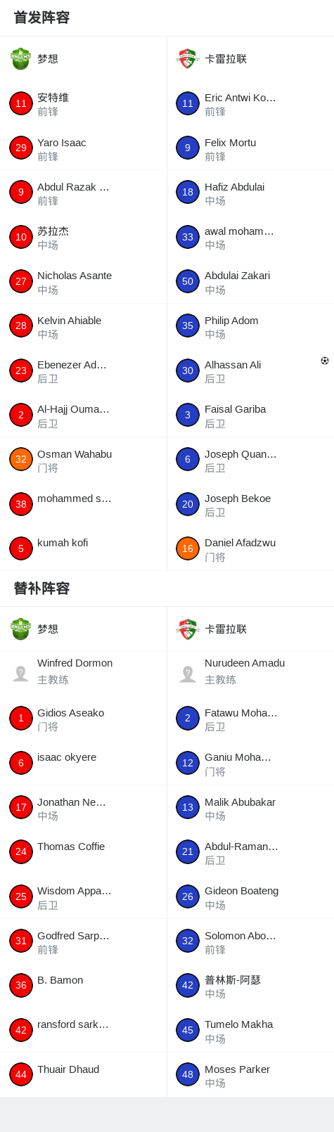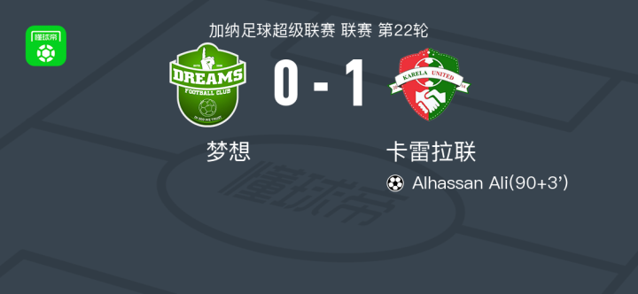 卡雷拉联1-0梦想,Alhassan Ali助球队取胜战报bot @懂球帝02-16 01:01北京时间2月15日加纳足球超级联赛 联赛 第22轮,梦想主场对阵卡雷拉联。卡雷拉联Alhassan Ali破门。最终比分梦想 0-1 卡雷拉联。点击查看本场比赛详细数据>>点击查看加纳超完整积分榜>>精彩瞬间下半场补时第3分钟,卡雷拉联球员Alhassan Ali打入一球。 球队阵容 技术统计 展开更多