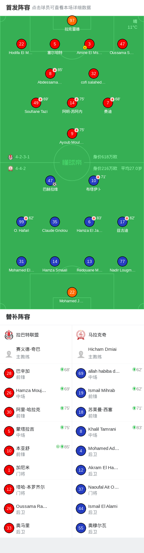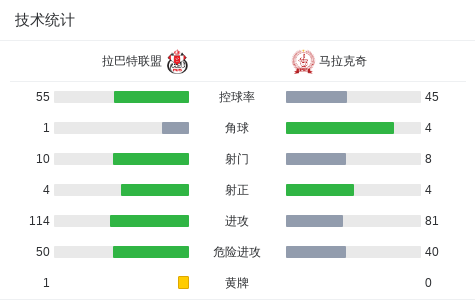 北京时间2月16日摩洛哥超级联赛 联赛 第12轮,拉巴特联盟主场对阵马拉克奇。拉巴特联盟本亚舒破门。马拉克奇巴赫拉维破门。最终比分拉巴特联盟 1-1 马拉克奇。