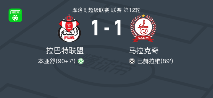拉巴特联盟1-1马拉克奇,巴赫拉维破门,本亚舒救主