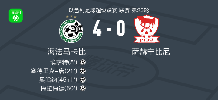 北京时间2月16日以色列足球超级联赛 联赛 第23轮,海法马卡比主场对阵萨赫宁比尼。海法马卡比埃萨特破门,塞德里克-唐破门,奥哈纳破门,梅拉梅德破门。最终比分海法马卡比 4-0 萨赫宁比尼。