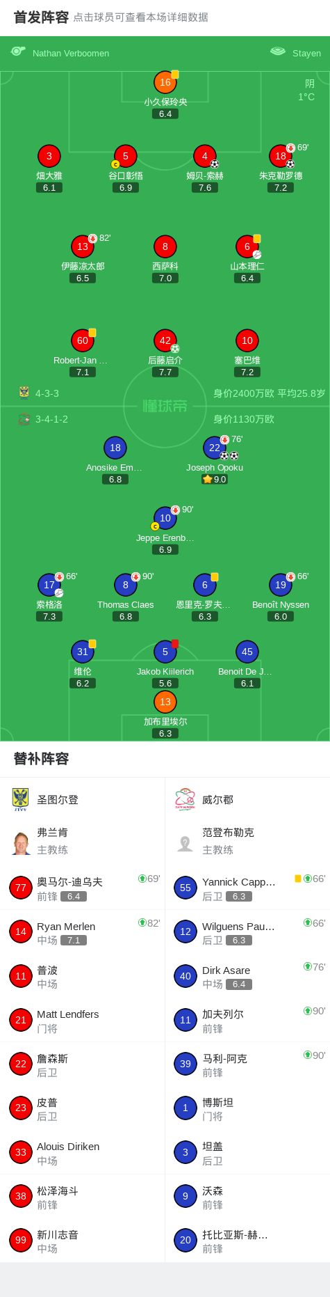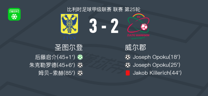 北京时间2月16日比利时足球甲级联赛 联赛 第25轮,圣图尔登主场对阵威尔郡。圣图尔登后藤启介破门,朱克勒罗德破门,姆贝-索赫破门。威尔郡Joseph Opoku梅开二度。最终比分圣图尔登 3-2 威尔郡。