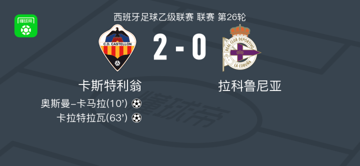 北京时间2月16日西班牙足球乙级联赛 联赛 第26轮,卡斯特利翁主场对阵拉科鲁尼亚。卡斯特利翁奥斯曼-卡马拉破门,卡拉特拉瓦破门。最终比分卡斯迪隆 2-0 拉科鲁尼亚。
