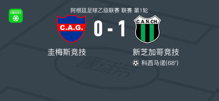 北京时间2月16日阿根廷足球乙级联赛 联赛 第1轮,圭梅斯竞技主场对阵新芝加哥竞技。新芝加哥竞技科西马诺破门。最终比分圭梅斯竞技 0-1 新芝加哥竞技。