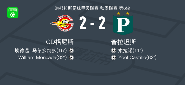 北京时间2月16日洪都拉斯足球甲级联赛 秋季联赛 第6轮,CD格尼斯主场对阵普拉坦斯。CD格尼斯埃德温-马尔多纳多破门,William Moncada破门。普拉坦斯索拉诺破门,Yoel Castillo破门。最终比分CD格尼斯 2-2 普拉坦斯。