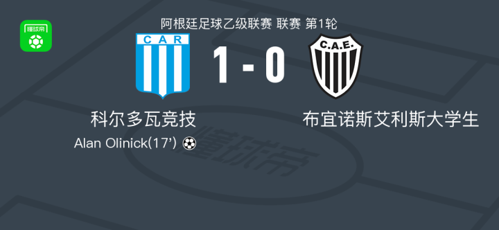 北京时间2月16日阿根廷足球乙级联赛 联赛 第1轮,科尔多瓦竞技主场对阵布宜诺斯艾利斯大学生。科尔多瓦竞技Alan Olinick破门。最终比分科尔多瓦竞技 1-0 布宜诺斯艾利斯大学生。