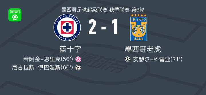 北京时间2月16日墨西哥足球超级联赛 秋季联赛 第6轮,蓝十字主场对阵墨西哥老虎。蓝十字尼古拉斯-伊巴涅斯破门。墨西哥老虎安赫尔-科雷亚破门,若阿金-恩里克自摆乌龙。最终比分蓝十字 2-1 墨西哥老虎。