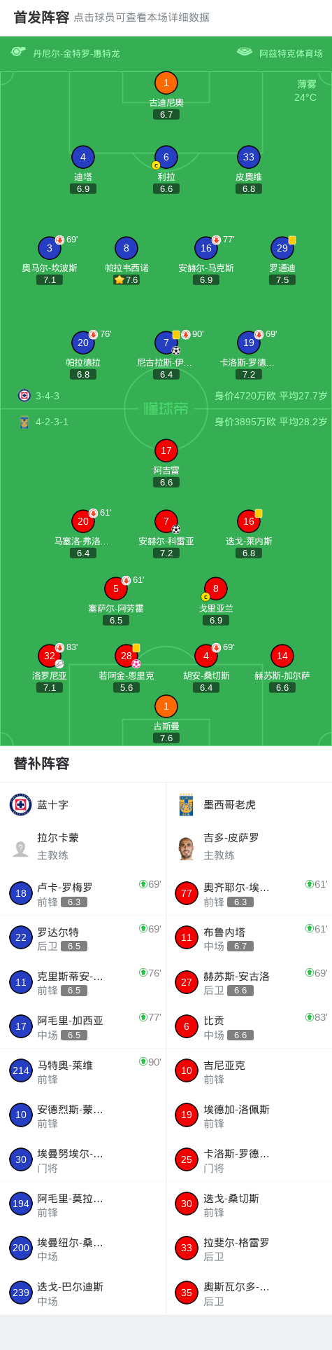 第71分钟,墨西哥老虎球员洛罗尼亚助攻安赫尔-科雷亚打入一球。
