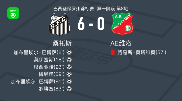 北京时间2月16日巴西圣保罗州锦标赛 第一阶段 第8轮,桑托斯对阵AE维洛。桑托斯加布里埃尔-巴博萨梅开二度,莫伊塞斯破门,塔西亚诺破门,梅尼诺破门,罗埃塞破门。最终比分桑托斯 6-0 AE维洛。