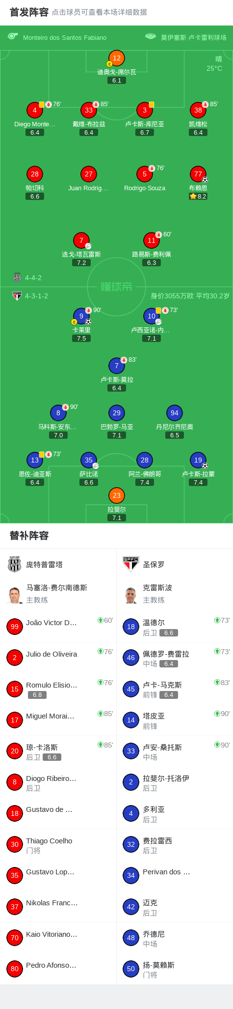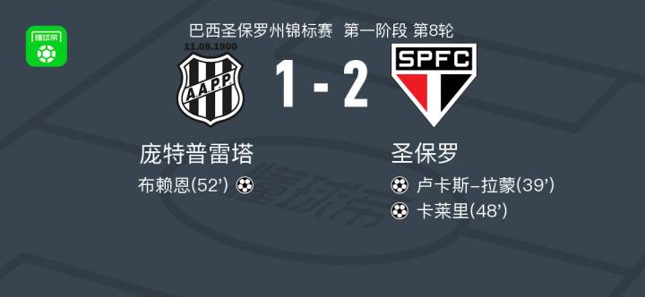 北京时间2月16日巴西圣保罗州锦标赛 第一阶段 第8轮,庞特普雷塔对阵圣保罗。庞特普雷塔布赖恩破门。圣保罗卢卡斯-拉蒙破门,卡莱里破门。最终比分庞特普雷塔 1-2 圣保罗。