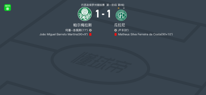 北京时间2月16日巴西圣保罗州锦标赛 第一阶段 第8轮,帕尔梅拉斯对阵瓜拉尼。帕尔梅拉斯何塞-洛佩斯破门。瓜拉尼卢卡破门。最终比分帕尔梅拉斯 1-1 瓜拉尼。