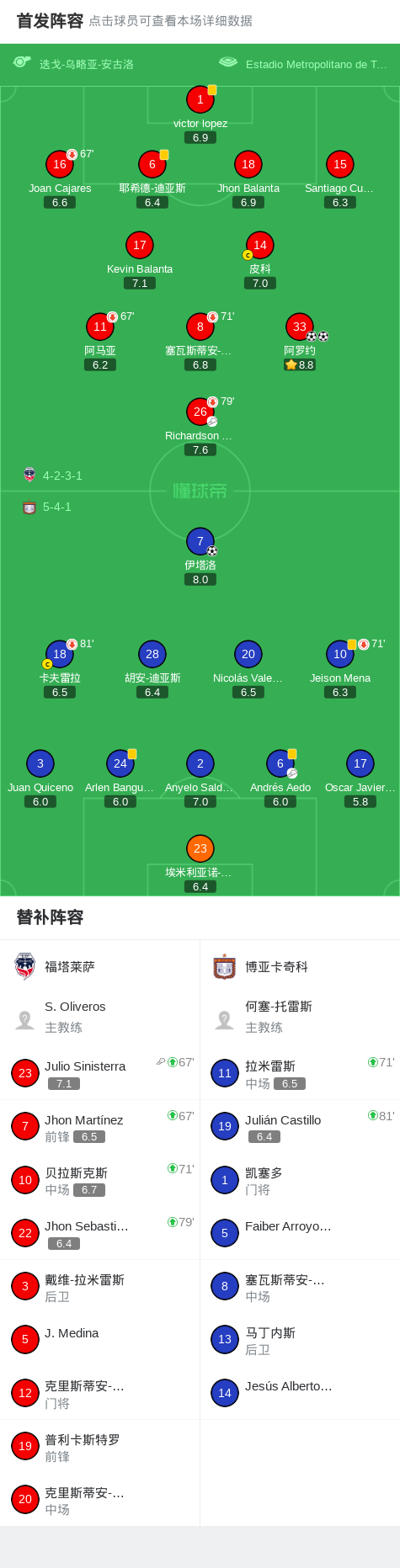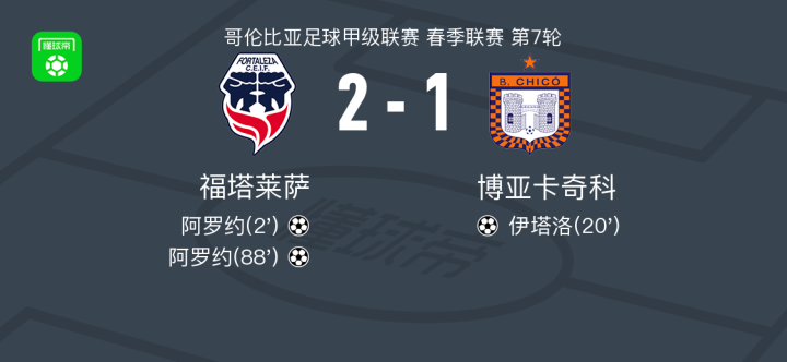 北京时间2月16日哥伦比亚足球甲级联赛 春季联赛 第7轮,福塔莱萨主场对阵博亚卡奇科。福塔莱萨阿罗约梅开二度。博亚卡奇科伊塔洛破门。最终比分福塔莱萨 2-1 博亚卡奇科。
