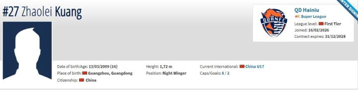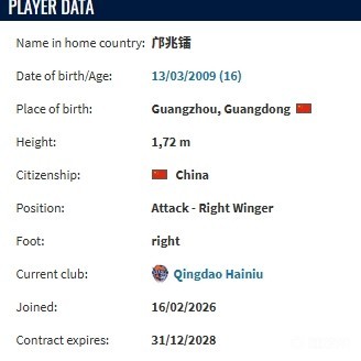德转:16岁前锋邝兆镭自由身加盟青岛海牛,双方签约3年盖坦9 @懂球帝02-16 20:06北京时间2月16日,德转更新,16岁前锋邝兆镭自由身加盟青岛海牛,双方签约3年。邝兆镭现年16岁,今年3月将年满17岁,司职前锋,目前是中国U17国家队成员。球员早年加入中国足球小将项目,此前曾在西班牙留洋,先后效力于CF达姆青年队、奥斯皮塔莱特青年队以及莱里达竞技。德转显示,邝兆镭与青岛海牛签约三年。展开更多